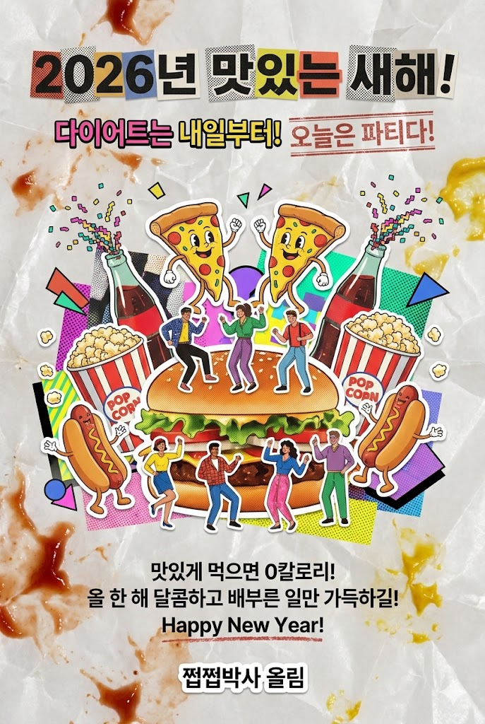 Design a vibrant retro collage poster style digital New Year greeting card for 2026 with a witty, artistic aesthetic reminiscent of 90s design. The image must be a direct, flat view of the card design itself, full-bleed edge-to-edge digital graphic card illustration. No borders, no margins, no external background. The overall mood is bold, eclectic, and fun, featuring a mix of cut-out imagery, halftone patterns, and sticker-like elements on a textured vintage paper surface. Card Surface & Texture (All text must be rendered in bold, eclectic, retro typography, mixing various fonts, distressed stamps, and cut-out letters): Card Surface: The card itself is made of [textured greaseproof paper from a fast-food restaurant, stained with ketchup and mustard hues, with a visible crumpled texture]. The texture should be highly visible. Header: At the top center, place a bold, prominent title using mixed retro fonts or cut-out letters: "2026년 맛있는 새해!". Below it, add a witty subtitle in a contrasting retro style: "다이어트는 내일부터! 오늘은 파티다!". Central Illustration: A dynamic retro collage illustration depicted flat on the card. The piece should be [a chaotic banquet of retro junk food: slices of pizza with smiling faces, dancing hotdogs, overflowing popcorn buckets, and soda bottles spraying confetti. A giant burger serves as a party stage for cutout people celebrating. It is composed of cut-out magazine images, halftone prints, abstract shapes, and sticker-like elements with white borders]. The composition should be witty, artistic, and layered. Message Body: In the lower center, include a 2-4 line message using distressed, stamped-style text or label maker font: "맛있게 먹으면 0칼로리! 올 한 해 달콤하고 배부른 일만 가득하길! Happy New Year!". Footer: At the very bottom, add the sender's name or brand name in a unique sticker or stamped signature style: "쩝쩝박사 올림". Style Notes: Flat lay design, isolated card view, retro collage, vintage poster, 90s color palette, halftone textures, distressed paper, bold typography, sticker art aesthetic, witty composition. Aspect Ratio: --ar 2:3