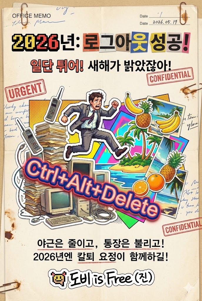 Design a vibrant retro collage poster style digital New Year greeting card for 2026 with a witty, artistic aesthetic reminiscent of 90s design. The image must be a direct, flat view of the card design itself, full-bleed edge-to-edge digital graphic card illustration. No borders, no margins, no external background. The overall mood is bold, eclectic, and fun, featuring a mix of cut-out imagery, halftone patterns, and sticker-like elements on a textured vintage paper surface. Card Surface & Texture (All text must be rendered in bold, eclectic, retro typography, mixing various fonts, distressed stamps, and cut-out letters): Card Surface: The card itself is made of [textured vintage office memo paper filled with scribbled notes, "URGENT" stamps, and paperclip rust marks]. The texture should be highly visible. Header: At the top center, place a bold, prominent title using mixed retro fonts or cut-out letters: "2026년: 로그아웃 성공!". Below it, add a witty subtitle in a contrasting retro style: "일단 튀어! 새해가 밝았잖아!". Central Illustration: A dynamic retro collage illustration depicted flat on the card. The piece should be [a humorous collage showing a stressed office worker cutout (with a pixelated face) jumping out of a chaotic pile of old paperwork and brick computers towards a tropical island paradise made of fruit stickers and travel brochures. A giant "Ctrl+Alt+Delete" keyboard shortcut is prominent. It is composed of cut-out magazine images, halftone prints, abstract shapes, and sticker-like elements with white borders]. The composition should be witty, artistic, and layered. Message Body: In the lower center, include a 2-4 line message using distressed, stamped-style text or label maker font: "야근은 줄이고, 통장은 불리고! 2026년엔 칼퇴 요정이 함께하길!". Footer: At the very bottom, add the sender's name or brand name in a unique sticker or stamped signature style: "도비 is Free (진)". Style Notes: Flat lay design, isolated card view, retro collage, vintage poster, 90s color palette, halftone textures, distressed paper, bold typography, sticker art aesthetic, witty composition. Aspect Ratio: --ar 2:3