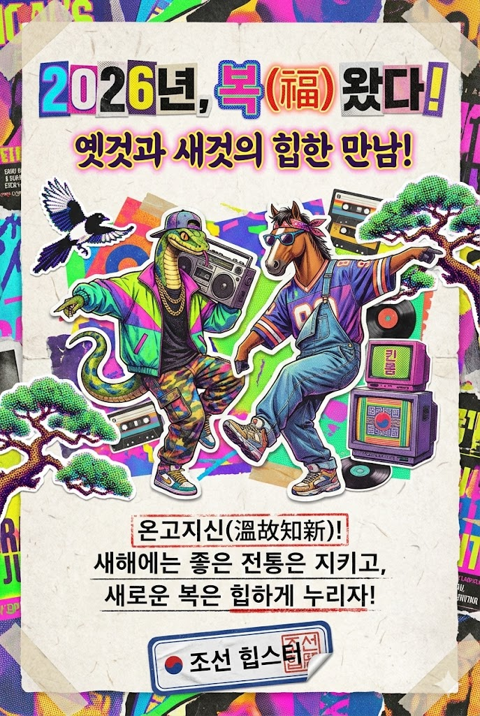 Design a vibrant retro collage poster style digital New Year greeting card for 2026 with a witty, artistic aesthetic reminiscent of 90s design. The image must be a direct, flat view of the card design itself, full-bleed edge-to-edge digital graphic card illustration. No borders, no margins, no external background. The overall mood is bold, eclectic, and fun, featuring a mix of cut-out imagery, halftone patterns, and sticker-like elements on a textured vintage paper surface. Card Surface & Texture (All text must be rendered in bold, eclectic, retro typography, mixing various fonts, distressed stamps, and cut-out letters): Card Surface: The card itself is made of [traditional Korean Hanji paper texture mixed with torn layers of vibrant 90s neon posters]. The texture should be highly visible. Header: At the top center, place a bold, prominent title using mixed retro fonts or cut-out letters: "2026년, 복(福) 왔다!". Below it, add a witty subtitle in a contrasting retro style: "옛것과 새것의 힙한 만남!". Central Illustration: A dynamic retro collage illustration depicted flat on the card. The piece should be [a witty reinterpretation of traditional Korean folk paintings. A snake(for the past) and a horse (for 2026) are wearing 90s hip-hop fashion (baggy pants, gold chains) and breakdancing together. Traditional elements like magpies and pine trees are rendered in halftone patterns and neon colors. It is composed of cut-out magazine images, halftone prints, abstract shapes, and sticker-like elements with white borders]. The composition should be witty, artistic, and layered. Message Body: In the lower center, include a 2-4 line message using distressed, stamped-style text or label maker font: "온고지신(溫故知新)! 새해에는 좋은 전통은 지키고, 새로운 복은 힙하게 누리자!". Footer: At the very bottom, add the sender's name or brand name in a unique sticker or stamped signature style: "조선 힙스터". Style Notes: Flat lay design, isolated card view, retro collage, vintage poster, 90s color palette, halftone textures, distressed paper, bold typography, sticker art aesthetic, witty composition. Aspect Ratio: --ar 2:3