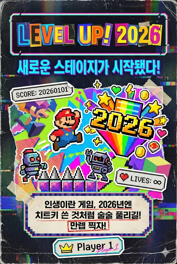 Design a vibrant retro collage poster style digital New Year greeting card for 2026 with a witty, artistic aesthetic reminiscent of 90s design. The image must be a direct, flat view of the card design itself, full-bleed edge-to-edge digital graphic card illustration. No borders, no margins, no external background. The overall mood is bold, eclectic, and fun, featuring a mix of cut-out imagery, halftone patterns, and sticker-like elements on a textured vintage paper surface. Card Surface & Texture (All text must be rendered in bold, eclectic, retro typography, mixing various fonts, distressed stamps, and cut-out letters): Card Surface: The card itself is made of [a textured surface resembling a scratched old game cartridge label or a pixelated screen with scanlines]. The texture should be highly visible. Header: At the top center, place a bold, prominent title using mixed retro fonts or cut-out letters: "LEVEL UP! 2026". Below it, add a witty subtitle in a contrasting retro style: "새로운 스테이지가 시작됐다!". Central Illustration: A dynamic retro collage illustration depicted flat on the card. The piece should be [a mix of 8-bit pixel art characters and low-poly 3D graphics from 90s gaming. A pixelated hero is jumping over obstacles towards a giant '2026' bonus item. Game UI elements like "SCORE: 20260101" and "LIVES: ∞" are included as stickers. It is composed of cut-out magazine images, halftone prints, abstract shapes, and sticker-like elements with white borders]. The composition should be witty, artistic, and layered. Message Body: In the lower center, include a 2-4 line message using distressed, stamped-style text or label maker font: "인생이란 게임, 2026년엔 치트키 쓴 것처럼 술술 풀리길! 만렙 찍자!". Footer: At the very bottom, add the sender's name or brand name in a unique sticker or stamped signature style: "Player 1". Style Notes: Flat lay design, isolated card view, retro collage, vintage poster, 90s color palette, halftone textures, distressed paper, bold typography, sticker art aesthetic, witty composition. Aspect Ratio: --ar 2:3