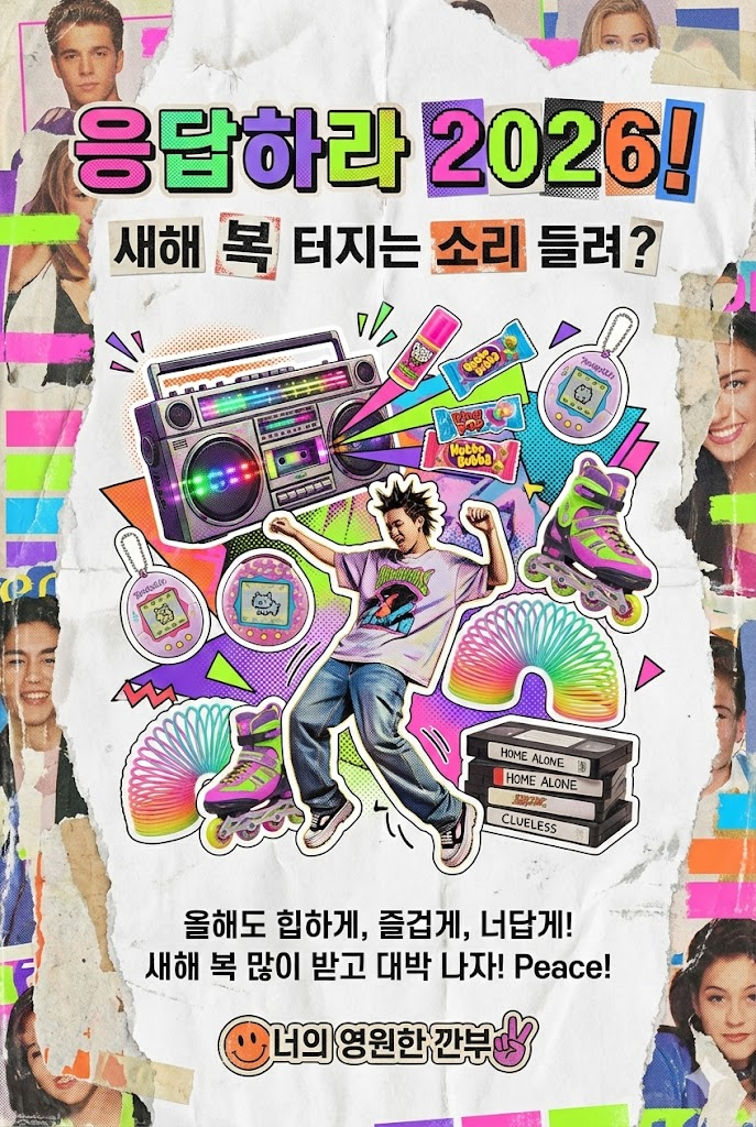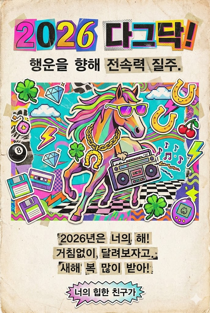 요청하신 내용을 바탕으로, 기존의 고급스럽고 미니멀한 구조는 유지하되 스타일을 완전히 탈바꿈시켰습니다. 90년대의 키치하고 자유분방한 감성, 잡지를 오려 붙인 듯한 재치 있는 콜라주, 그리고 강렬한 타이포그래피가 어우러진 '레트로 콜라주 포스터' 스타일의 연하장 프롬프트입니다.