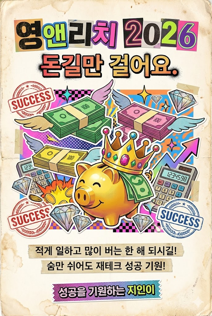 Header: At the top center, place a bold, prominent title using mixed retro fonts or cut-out letters: 영앤리치 2026. Below it, add a witty subtitle in a contrasting retro style: 돈길만 걸어요.