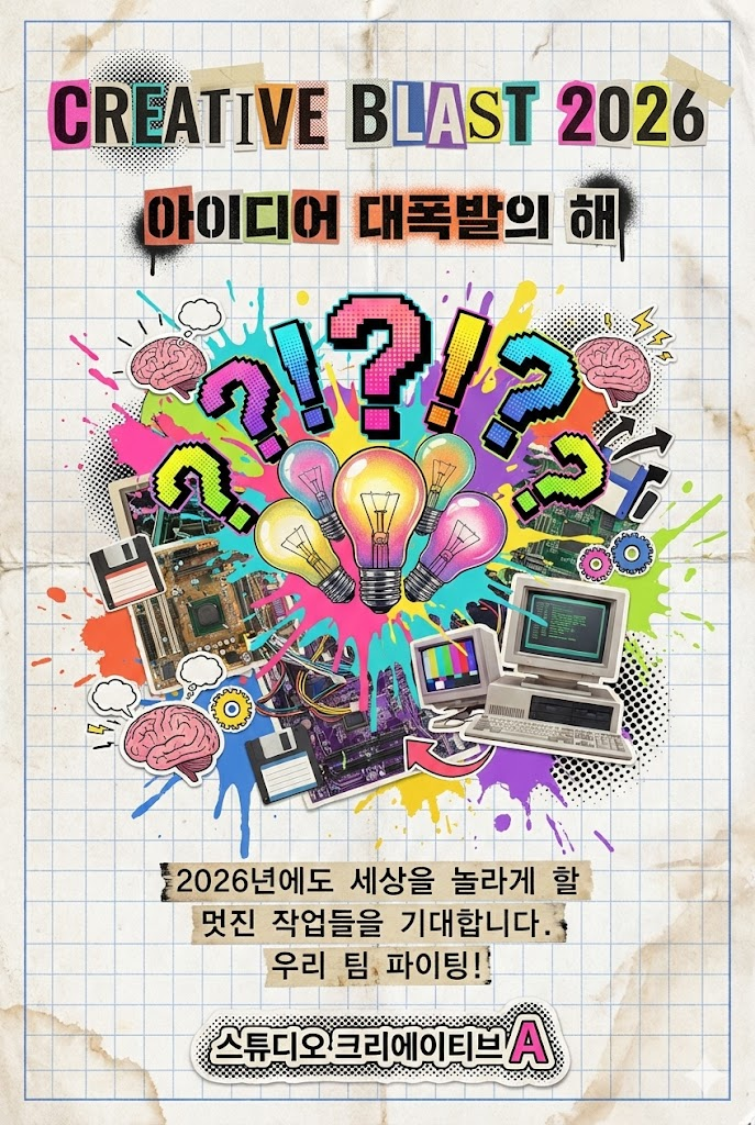 Header: At the top center, place a bold, prominent title using mixed retro fonts or cut-out letters: CREATIVE BLAST 2026. Below it, add a witty subtitle in a contrasting retro style: 아이디어 대폭발의 해.