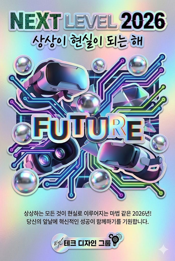 Design a vibrant modern collage poster style digital New Year greeting card for 2026 with a witty, artistic aesthetic. The image must be a direct, flat view of the card design itself, full-bleed edge-to-edge digital graphic card illustration. No borders, no margins, no external background. The overall mood is bold, eclectic, and fun, featuring a mix of sharp cut-out imagery, high-quality printed elements, and sticker-like elements on a clean, smooth matte paper surface. Card Surface & Texture (All text must be rendered in bold, eclectic, modern typography, mixing various contemporary fonts and clean cut-out letters): Card Surface: The card itself is made of [futuristic holographic cardstock with a base of sleek silver grey]. The texture should be subtle, clean, and premium. Header: At the top center, place a bold, prominent title using modern mixed fonts or clean cut-out letters: NEXT LEVEL 2026. Below it, add a witty subtitle in a contrasting contemporary style: 상상이 현실이 되는 해. Central Illustration: A dynamic modern collage illustration depicted flat on the card. The piece should be [a tech-focused collage of high-res VR headset cut-outs, glowing neon circuit line stickers, and 3D floating chrome spheres. Iridescent FUTURE text art]. The composition should be witty, artistic, and layered. Message Body: In the lower center, include a 2-4 line message using clean, modern sans-serif text or minimalist label font: "상상하는 모든 것이 현실로 이루어지는 마법 같은 2026년! 당신의 앞날에 혁신적인 성공이 함께하기를 기원합니다.". Footer: At the very bottom, add the sender's name or brand name in a unique modern sticker or clean signature style: "테크 디자인 그룹". Style Notes: Flat lay design, isolated card view, modern collage, contemporary poster, vibrant color palette, smooth textures, clean paper, bold typography, sticker art aesthetic, witty composition. --ar 2:3
