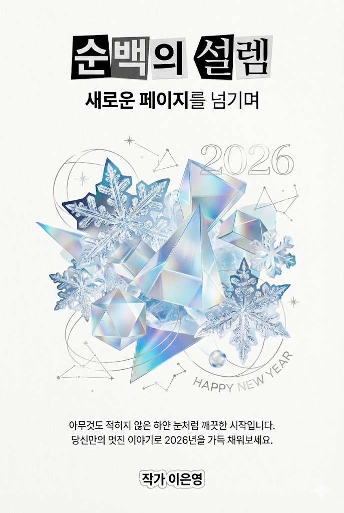 Design a vibrant modern collage poster style digital New Year greeting card for 2026 with a witty, artistic aesthetic. The image must be a direct, flat view of the card design itself, full-bleed edge-to-edge digital graphic card illustration. No borders, no margins, no external background. The overall mood is bold, eclectic, and fun, featuring a mix of sharp cut-out imagery, high-quality printed elements, and sticker-like elements on a clean, smooth matte paper surface. Card Surface & Texture (All text must be rendered in bold, eclectic, modern typography, mixing various contemporary fonts and clean cut-out letters): Card Surface: The card itself is made of [modern  vellum-style paper effect in a frosty white]. The texture should be subtle, clean, and premium. Header: At the top center, place a bold, prominent title using modern mixed fonts or clean cut-out letters: "순백의 설렘". Below it, add a witty subtitle in a contrasting contemporary style: 새로운 페이지를 넘기며. Central Illustration: A dynamic modern collage illustration depicted flat on the card. The piece should be [a crisp collage of glass-like geometric shapes, high-res ice crystal cut-outs, and minimalist silver foil line stickers. The design is airy and sophisticated]. The composition should be witty, artistic, and layered. Message Body: In the lower center, include a 2-4 line message using clean, modern sans-serif text or minimalist label font: "아무것도 적히지 않은 하얀 눈처럼 깨끗한 시작입니다. 당신만의 멋진 이야기로 2026년을 가득 채워보세요.". Footer: At the very bottom, add the sender's name or brand name in a unique modern sticker or clean signature style: "작가 이은영". Style Notes: Flat lay design, isolated card view, modern collage, contemporary poster, vibrant color palette, smooth textures, clean paper, bold typography, sticker art aesthetic, witty composition. --ar 2:3