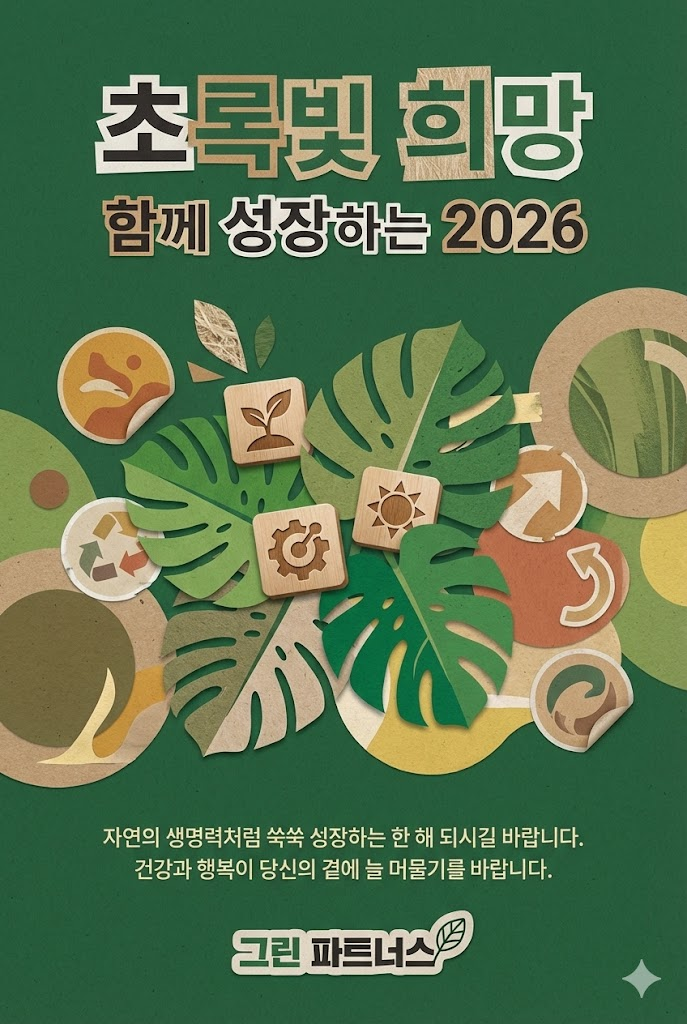 Design a vibrant modern collage poster style digital New Year greeting card for 2026 with a witty, artistic aesthetic. The image must be a direct, flat view of the card design itself, full-bleed edge-to-edge digital graphic card illustration. No borders, no margins, no external background. The overall mood is bold, eclectic, and fun, featuring a mix of sharp cut-out imagery, high-quality printed elements, and sticker-like elements on a clean, smooth matte paper surface. Card Surface & Texture (All text must be rendered in bold, eclectic, modern typography, mixing various contemporary fonts and clean cut-out letters): Card Surface: The card itself is made of [clean, high-quality recycled kraft paper in a rich forest green]. The texture should be subtle, clean, and premium. Header: At the top center, place a bold, prominent title using modern mixed fonts or clean cut-out letters: "초록빛 희망". Below it, add a witty subtitle in a contrasting contemporary style: "함께 성장하는 2026". Central Illustration: A dynamic modern collage illustration depicted flat on the card. The piece should be [a botanical collage with sharp cut-outs of monstera leaves, wooden block icons, and recycled paper texture stickers. Earthy-toned abstract circles provide a modern balance]. The composition should be witty, artistic, and layered. Message Body: In the lower center, include a 2-4 line message using clean, modern sans-serif text or minimalist label font: "자연의 생명력처럼 쑥쑥 성장하는 한 해 되시길 바랍니다. 건강과 행복이 당신의 곁에 늘 머물기를 바랍니다.". Footer: At the very bottom, add the sender's name or brand name in a unique modern sticker or clean signature style: "그린 파트너스". Style Notes: Flat lay design, isolated card view, modern collage, contemporary poster, vibrant color palette, smooth textures, clean paper, bold typography, sticker art aesthetic, witty composition. --ar 2:3