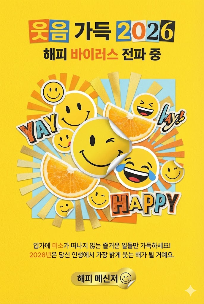 Design a vibrant modern collage poster style digital New Year greeting card for 2026 with a witty, artistic aesthetic. The image must be a direct, flat view of the card design itself, full-bleed edge-to-edge digital graphic card illustration. No borders, no margins, no external background. The overall mood is bold, eclectic, and fun, featuring a mix of sharp cut-out imagery, high-quality printed elements, and sticker-like elements on a clean, smooth matte paper surface. Card Surface & Texture (All text must be rendered in bold, eclectic, modern typography, mixing various contemporary fonts and clean cut-out letters): Card Surface: The card itself is made of [clean hammered textured paper in a vibrant sunny yellow]. The texture should be subtle, clean, and premium. Header: At the top center, place a bold, prominent title using modern mixed fonts or clean cut-out letters: 웃음 가득 2026. Below it, add a witty subtitle in a contrasting contemporary style: 해피 바이러스 전파 중. Central Illustration: A dynamic modern collage illustration depicted flat on the card. The piece should be [a playful collage of bright yellow smiley face stickers, cut-out slices of juicy oranges, and abstract sunburst patterns. Quirky YAY and HAPPY word art elements]. The composition should be witty, artistic, and layered. Message Body: In the lower center, include a 2-4 line message using clean, modern sans-serif text or minimalist label font: "입가에 미소가 떠나지 않는 즐거운 일들만 가득하세요! 2026년은 당신 인생에서 가장 밝게 웃는 해가 될 거예요.". Footer: At the very bottom, add the sender's name or brand name in a unique modern sticker or clean signature style: "해피 메신저". Style Notes: Flat lay design, isolated card view, modern collage, contemporary poster, vibrant color palette, smooth textures, clean paper, bold typography, sticker art aesthetic, witty composition. --ar 2:3