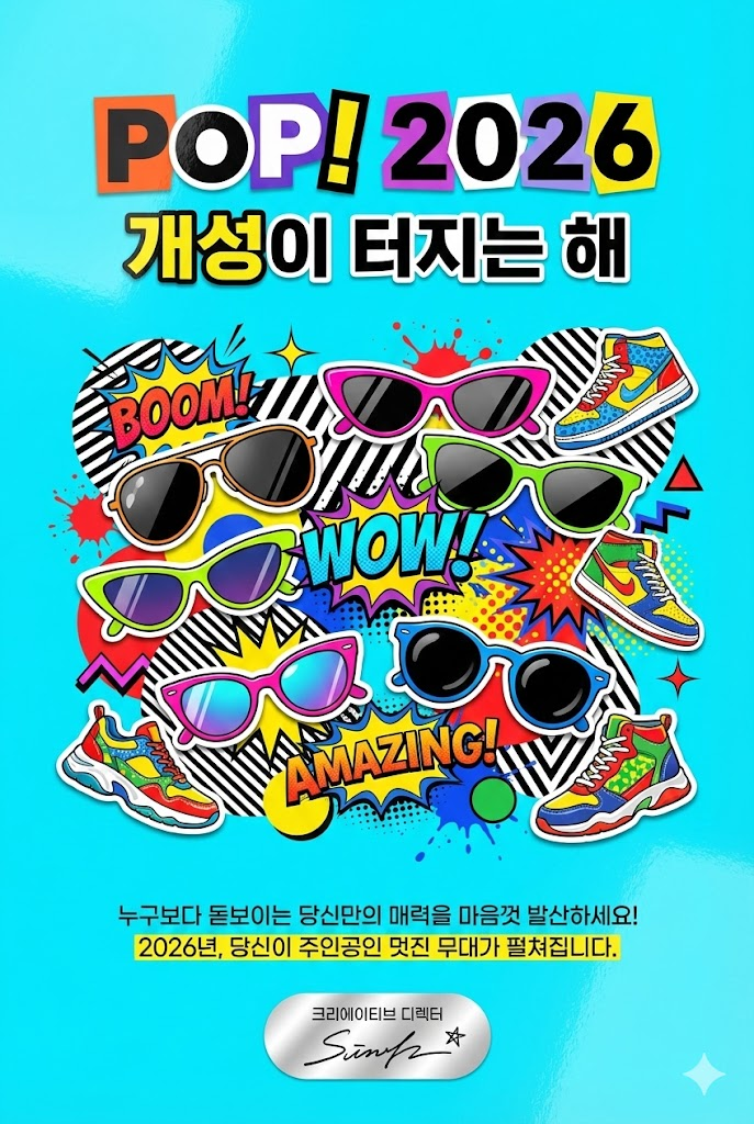Design a vibrant modern collage poster style digital New Year greeting card for 2026 with a witty, artistic aesthetic. The image must be a direct, flat view of the card design itself, full-bleed edge-to-edge digital graphic card illustration. No borders, no margins, no external background. The overall mood is bold, eclectic, and fun, featuring a mix of sharp cut-out imagery, high-quality printed elements, and sticker-like elements on a clean, smooth matte paper surface. Card Surface & Texture (All text must be rendered in bold, eclectic, modern typography, mixing various contemporary fonts and clean cut-out letters): Card Surface: The card itself is made of [high-gloss photo paper in a vibrant electric cyan]. The texture should be subtle, clean, and premium. Header: At the top center, place a bold, prominent title using modern mixed fonts or clean cut-out letters: POP! 2026. Below it, add a witty subtitle in a contrasting contemporary style: 개성이 터지는 해. Central Illustration: A dynamic modern collage illustration depicted flat on the card. The piece should be [a pop-art collage of high-contrast sunglasses cut-outs, vibrant BOOM speech bubbles, and colorful sneaker stickers. Bold black and white striped patterns in the background]. The composition should be witty, artistic, and layered. Message Body: In the lower center, include a 2-4 line message using clean, modern sans-serif text or minimalist label font: "누구보다 돋보이는 당신만의 매력을 마음껏 발산하세요! 2026년, 당신이 주인공인 멋진 무대가 펼쳐집니다.". Footer: At the very bottom, add the sender's name or brand name in a unique modern sticker or clean signature style: "크리에이티브 디렉터". Style Notes: Flat lay design, isolated card view, modern collage, contemporary poster, vibrant color palette, smooth textures, clean paper, bold typography, sticker art aesthetic, witty composition. --ar 2:3