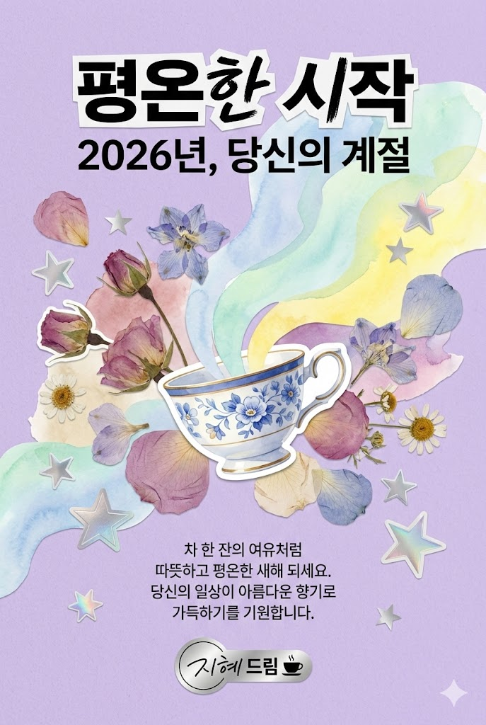 Design a vibrant modern collage poster style digital New Year greeting card for 2026 with a witty, artistic aesthetic. The image must be a direct, flat view of the card design itself, full-bleed edge-to-edge digital graphic card illustration. No borders, no margins, no external background. The overall mood is bold, eclectic, and fun, featuring a mix of sharp cut-out imagery, high-quality printed elements, and sticker-like elements on a clean, smooth matte paper surface. Card Surface & Texture (All text must be rendered in bold, eclectic, modern typography, mixing various contemporary fonts and clean cut-out letters): Card Surface: The card itself is made of [premium linen textured paper in a soft lavender color]. The texture should be subtle, clean, and premium. Header: At the top center, place a bold, prominent title using modern mixed fonts or clean cut-out letters: "평온한 시작". Below it, add a witty subtitle in a contrasting contemporary style:"2026년, 당신의 계절". Central Illustration: A dynamic modern collage illustration depicted flat on the card. The piece should be [a minimalist collage of floating dried flower petals, a porcelain tea cup cut-out, and soft watercolor wash shapes. Silver star stickers add a touch of magic]. The composition should be witty, artistic, and layered. Message Body: In the lower center, include a 2-4 line message using clean, modern sans-serif text or minimalist label font: "차 한 잔의 여유처럼 따뜻하고 평온한 새해 되세요. 당신의 일상이 아름다운 향기로 가득하기를 기원합니다.". Footer: At the very bottom, add the sender's name or brand name in a unique modern sticker or clean signature style: "지혜 드림". Style Notes: Flat lay design, isolated card view, modern collage, contemporary poster, vibrant color palette, smooth textures, clean paper, bold typography, sticker art aesthetic, witty composition. --ar 2:3