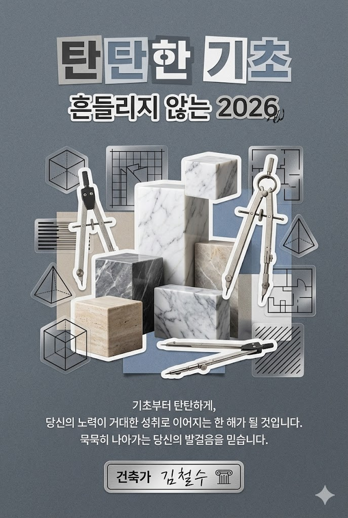 Design a vibrant modern collage poster style digital New Year greeting card for 2026 with a witty, artistic aesthetic. The image must be a direct, flat view of the card design itself, full-bleed edge-to-edge digital graphic card illustration. No borders, no margins, no external background. The overall mood is bold, eclectic, and fun, featuring a mix of sharp cut-out imagery, high-quality printed elements, and sticker-like elements on a clean, smooth matte paper surface. Card Surface & Texture (All text must be rendered in bold, eclectic, modern typography, mixing various contemporary fonts and clean cut-out letters): Card Surface: The card itself is made of [fine felt textured paper in a professional slate grey]. The texture should be subtle, clean, and premium. Header: At the top center, place a bold, prominent title using modern mixed fonts or clean cut-out letters: 탄탄한 기초. Below it, add a witty subtitle in a contrasting contemporary style: 흔들리지 않는 2026. Central Illustration: A dynamic modern collage illustration depicted flat on the card. The piece should be [an architectural collage of clean-cut marble block images, drafting compass cut-outs, and minimalist black line stickers. Structured geometric shapes in muted tones]. The composition should be witty, artistic, and layered. Message Body: In the lower center, include a 2-4 line message using clean, modern sans-serif text or minimalist label font: "기초부터 탄탄하게, 당신의 노력이 거대한 성취로 이어지는 한 해가 될 것입니다. 묵묵히 나아가는 당신의 발걸음을 믿습니다.". Footer: At the very bottom, add the sender's name or brand name in a unique modern sticker or clean signature style: "건축가 김철수". Style Notes: Flat lay design, isolated card view, modern collage, contemporary poster, vibrant color palette, smooth textures, clean paper, bold typography, sticker art aesthetic, witty composition. --ar 2:3