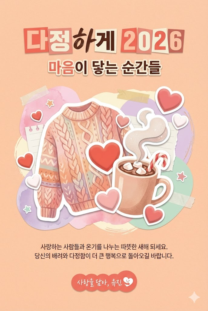 Design a vibrant modern collage poster style digital New Year greeting card for 2026 with a witty, artistic aesthetic. The image must be a direct, flat view of the card design itself, full-bleed edge-to-edge digital graphic card illustration. No borders, no margins, no external background. The overall mood is bold, eclectic, and fun, featuring a mix of sharp cut-out imagery, high-quality printed elements, and sticker-like elements on a clean, smooth matte paper surface. Card Surface & Texture (All text must be rendered in bold, eclectic, modern typography, mixing various contemporary fonts and clean cut-out letters): Card Surface: The card itself is made of [thick, soft cotton paper in a warm soft peach color]. The texture should be subtle, clean, and premium. Header: At the top center, place a bold, prominent title using modern mixed fonts or clean cut-out letters:  다정하게 2026. Below it, add a witty subtitle in a contrasting contemporary style: 마음이 닿는 순간들. Central Illustration: A dynamic modern collage illustration depicted flat on the card. The piece should be [a cozy collage featuring a hand-knit sweater texture cut-out, a steaming cocoa mug, and soft heart-shaped stickers. Pastel-toned abstract blobs create a comforting background]. The composition should be witty, artistic, and layered. Message Body: In the lower center, include a 2-4 line message using clean, modern sans-serif text or minimalist label font: "사랑하는 사람들과 온기를 나누는 따뜻한 새해 되세요. 당신의 배려와 다정함이 더 큰 행복으로 돌아오길 바랍니다.". Footer: At the very bottom, add the sender's name or brand name in a unique modern sticker or clean signature style: "사랑을 담아, 유진". Style Notes: Flat lay design, isolated card view, modern collage, contemporary poster, vibrant color palette, smooth textures, clean paper, bold typography, sticker art aesthetic, witty composition. --ar 2:3