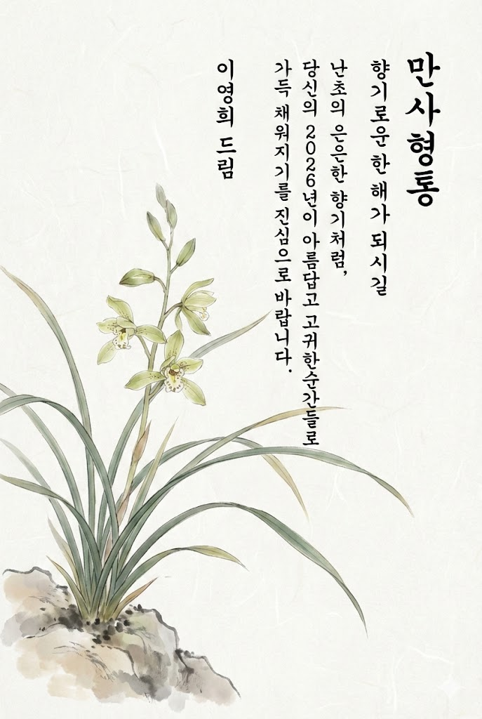 Text Component (Right Section - Vertical Writing): All text is placed vertically on the right side in an elegant and legible ink brush handwriting style Korean script with visible brush texture. The text is read from top to bottom. Far Right Column (Header): A clean vertical title: " 만사형통 ". Second Column from Right (Subtitle): A small, sophisticated vertical subtitle: " 향기로운 한 해가 되시길 ". Central Columns (Message Body): A heartfelt 2-4 line vertical message: " 난초의 은은한 향기처럼, 당신의 2026년이 아름답고 고귀한 순간들로 가득 채워지기를 진심으로 바랍니다. ". Leftmost Text Column (Footer): The sender's name or brand name in a subtle vertical signature style: " 이영희 드림 ".