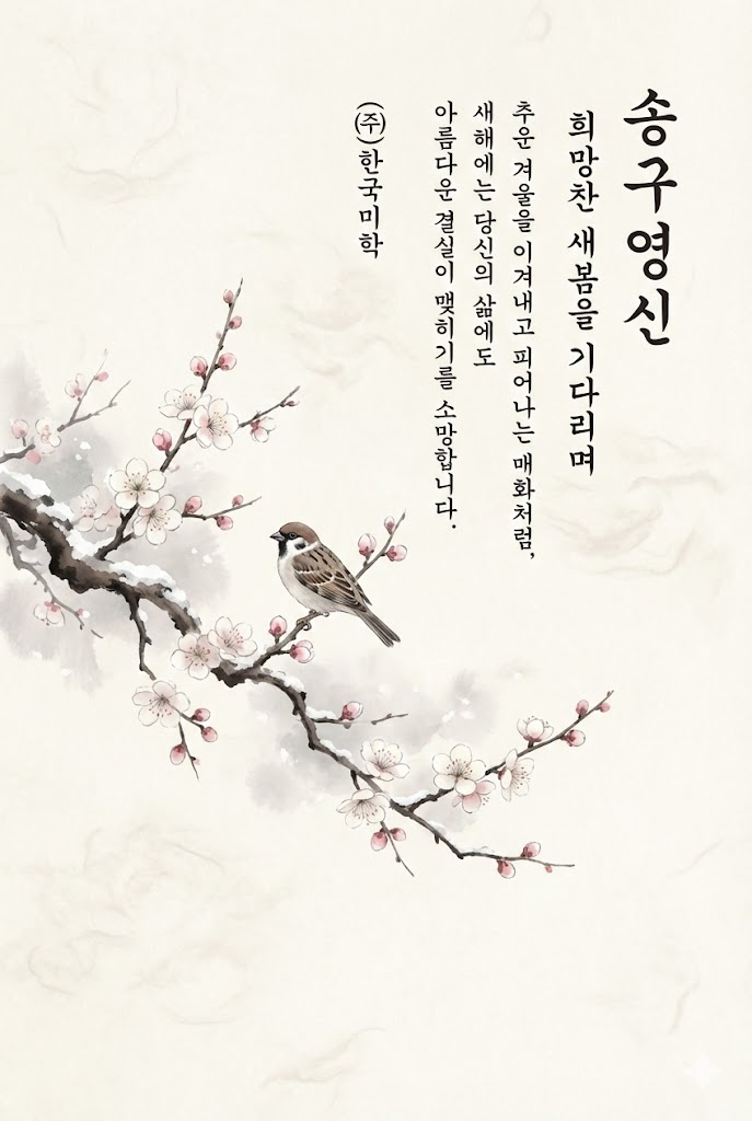 Text Component (Right Section - Vertical Writing): All text is placed vertically on the right side in an elegant and legible ink brush handwriting style Korean script with visible brush texture. The text is read from top to bottom. Far Right Column (Header): A clean vertical title: " 송구영신 ". Second Column from Right (Subtitle): A small, sophisticated vertical subtitle: " 희망찬 새봄을 기다리며 ". Central Columns (Message Body): A heartfelt 2-4 line vertical message: " 추운 겨울을 이겨내고 피어나는 매화처럼, 새해에는 당신의 삶에도 아름다운 결실이 맺히기를 소망합니다. ". Leftmost Text Column (Footer): The sender's name or brand name in a subtle vertical signature style: " (주)한국미학 ".