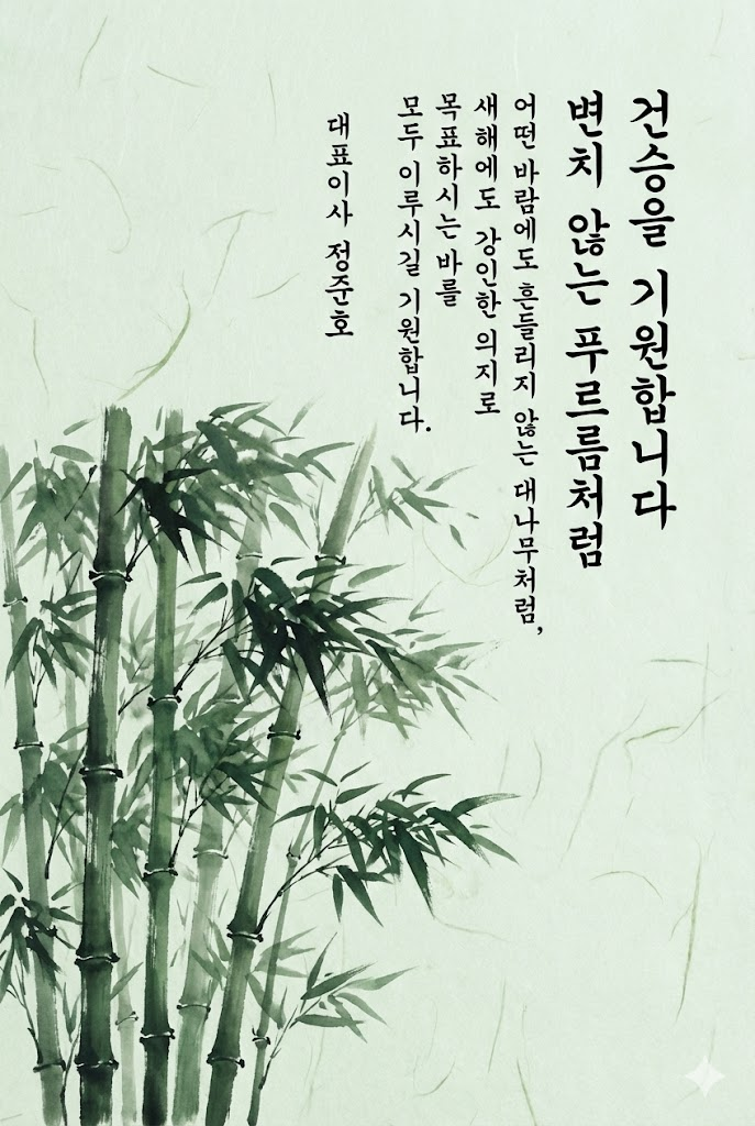 Text Component (Right Section - Vertical Writing): All text is placed vertically on the right side in an elegant and legible ink brush handwriting style Korean script with visible brush texture. The text is read from top to bottom. Far Right Column (Header): A clean vertical title: " 건승을 기원합니다 ". Second Column from Right (Subtitle): A small, sophisticated vertical subtitle: " 변치 않는 푸르름처럼 ". Central Columns (Message Body): A heartfelt 2-4 line vertical message: " 어떤 바람에도 흔들리지 않는 대나무처럼, 새해에도 강인한 의지로 목표하시는 바를 모두 이루시길 기원합니다. ". Leftmost Text Column (Footer): The sender's name or brand name in a subtle vertical signature style: " 대표이사 정준호 ".