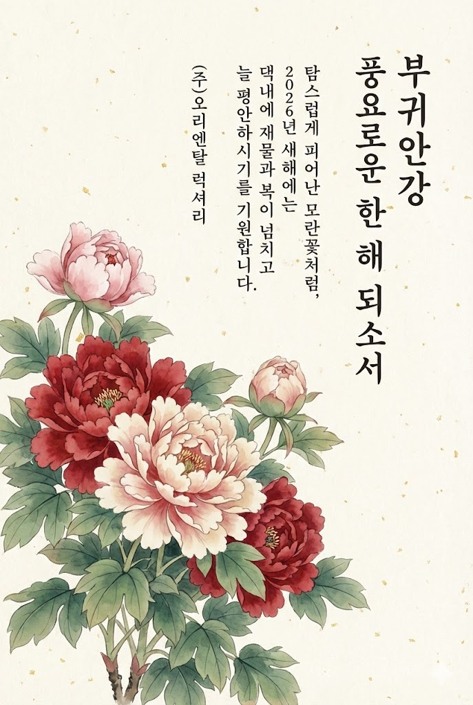 Text Component (Right Section - Vertical Writing): All text is placed vertically on the right side in an elegant and legible ink brush handwriting style Korean script with visible brush texture. The text is read from top to bottom. Far Right Column (Header): A clean vertical title: " 부귀안강 ". Second Column from Right (Subtitle): A small, sophisticated vertical subtitle: " 풍요로운 한 해 되소서 ". Central Columns (Message Body): A heartfelt 2-4 line vertical message: " 탐스럽게 피어난 모란꽃처럼, 2026년 새해에는 댁내에 재물과 복이 넘치고 늘 평안하시기를 기원합니다. ". Leftmost Text Column (Footer): The sender's name or brand name in a subtle vertical signature style: " (주)오리엔탈 럭셔리 ".