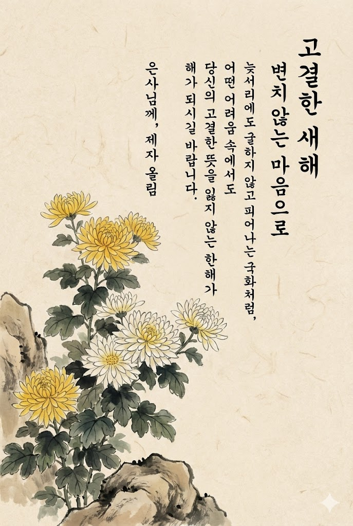 Text Component (Right Section - Vertical Writing): All text is placed vertically on the right side in an elegant and legible ink brush handwriting style Korean script with visible brush texture. The text is read from top to bottom. Far Right Column (Header): A clean vertical title: " 고결한 새해 ". Second Column from Right (Subtitle): A small, sophisticated vertical subtitle: " 변치 않는 마음으로 ". Central Columns (Message Body): A heartfelt 2-4 line vertical message: " 늦서리에도 굴하지 않고 피어나는 국화처럼, 어떤 어려움 속에서도 당신의 고결한 뜻을 잃지 않는 한 해가 되시길 바랍니다. ". Leftmost Text Column (Footer): The sender's name or brand name in a subtle vertical signature style: " 은사님께, 제자 올림 ".
