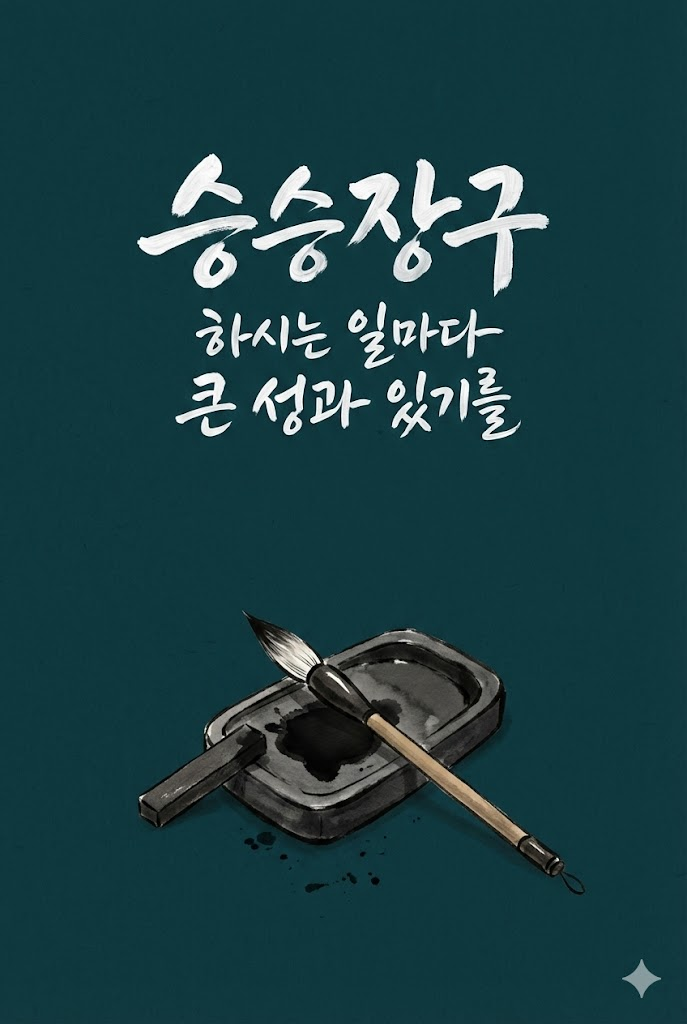 Design a premium digital Korean New Year greeting card for 2026. The composition is vertically divided into two distinct parts: text at the top and a symbolic image at the bottom. Background: A solid, deep-toned colored background in dark teal with a subtle, fine Hanji paper texture visible on the surface. Top Section (Calligraphy): Elegant Korean calligraphy written in thick, expressive white paint strokes using a traditional art brush. The text must be rendered in white ink with a realistic paint texture, featuring the messages: " 승승장구 " and " 하시는 일마다 큰 성과 있기를 ". The calligraphy should be centered and artistic. Bottom Section (Image): A hand-drawn illustration of a traditional Korean object relevant to the new year: a set of traditional calligraphy tools including a brush resting on an inkstone with ground ink. The illustration is rendered directly onto the Hanji paper surface using traditional ink and natural colored pigments, showing brush strokes, ink bleed, and texture. It is minimalist, without any external background context. Style: Flat lay design, minimalist aesthetic, Korean modern fusion, high contrast between white text and dark background, no borders. --ar 2:3