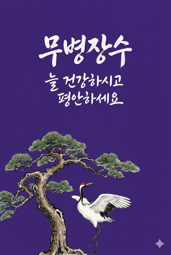 Design a premium digital Korean New Year greeting card for 2026. The composition is vertically divided into two distinct parts: text at the top and a symbolic image at the bottom. Background: A solid, deep-toned colored background in deep royal purple with a subtle, fine Hanji paper texture visible on the surface. Top Section (Calligraphy): Elegant Korean calligraphy written in thick, expressive white paint strokes using a traditional art brush. The text must be rendered in white ink with a realistic paint texture, featuring the messages: " 무병장수 " and " 늘 건강하시고 평안하세요 ". The calligraphy should be centered and artistic. Bottom Section (Image): A hand-drawn illustration of a traditional Korean object relevant to the new year: a traditional painting style illustration of a red-crowned crane standing beside a sturdy pine tree. The illustration is rendered directly onto the Hanji paper surface using traditional ink and natural colored pigments, showing brush strokes, ink bleed, and texture. It is minimalist, without any external background context. Style: Flat lay design, minimalist aesthetic, Korean modern fusion, high contrast between white text and dark background, no borders. --ar 2:3