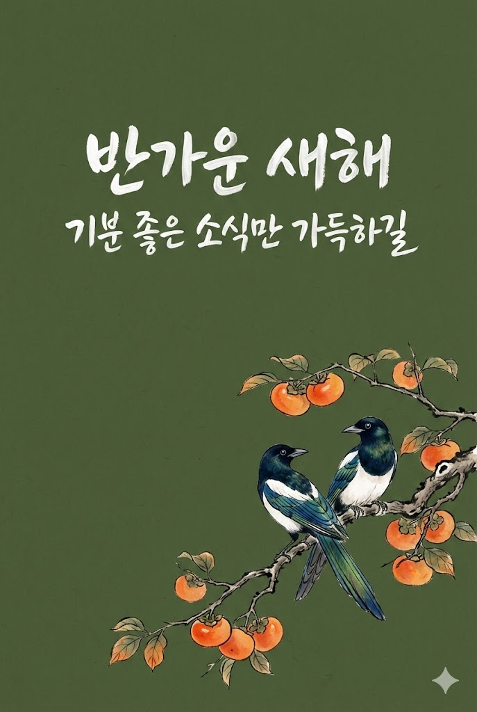 Design a premium digital Korean New Year greeting card for 2026. The composition is vertically divided into two distinct parts: text at the top and a symbolic image at the bottom. Background: A solid, deep-toned colored background in deep olive green with a subtle, fine Hanji paper texture visible on the surface. Top Section (Calligraphy): Elegant Korean calligraphy written in thick, expressive white paint strokes using a traditional art brush. The text must be rendered in white ink with a realistic paint texture, featuring the messages: " 반가운 새해 " and " 기분 좋은 소식만 가득하길 ". The calligraphy should be centered and artistic. Bottom Section (Image): A hand-drawn illustration of a traditional Korean object relevant to the new year: a pair of Korean magpies perched on a persimmon tree branch. The illustration is rendered directly onto the Hanji paper surface using traditional ink and natural colored pigments, showing brush strokes, ink bleed, and texture. It is minimalist, without any external background context. Style: Flat lay design, minimalist aesthetic, Korean modern fusion, high contrast between white text and dark background, no borders. --ar 2:3