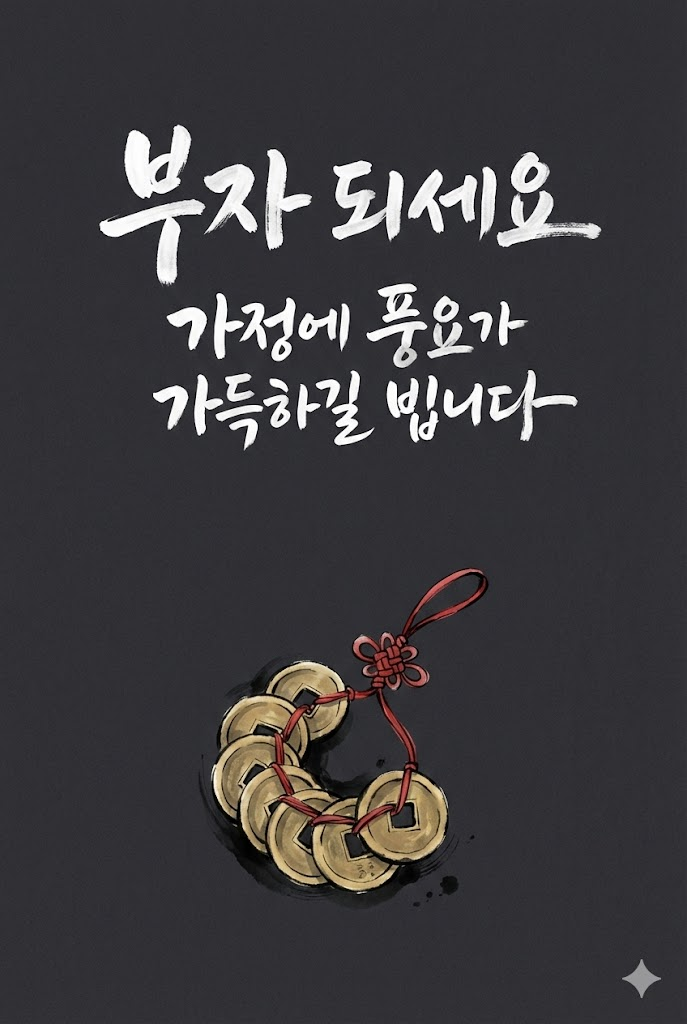 Design a premium digital Korean New Year greeting card for 2026. The composition is vertically divided into two distinct parts: text at the top and a symbolic image at the bottom. Background: A solid, deep-toned colored background in charcoal grey with a subtle, fine Hanji paper texture visible on the surface. Top Section (Calligraphy): Elegant Korean calligraphy written in thick, expressive white paint strokes using a traditional art brush. The text must be rendered in white ink with a realistic paint texture, featuring the messages: " 부자 되세요 " and " 가정에 풍요가 가득하길 빕니다 ". The calligraphy should be centered and artistic. Bottom Section (Image): A hand-drawn illustration of a traditional Korean object relevant to the new year: a bundle of old Korean brass coins (yeopjeon) tied together with a red string. The illustration is rendered directly onto the Hanji paper surface using traditional ink and natural colored pigments, showing brush strokes, ink bleed, and texture. It is minimalist, without any external background context. Style: Flat lay design, minimalist aesthetic, Korean modern fusion, high contrast between white text and dark background, no borders. --ar 2:3