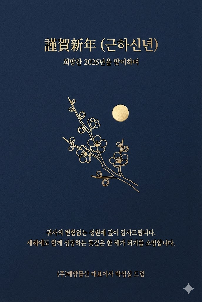 Footer: At the very bottom, add the sender's name or brand name in a subtle, refined gold foil signature style: "[(주)태양물산 대표이사 박성실 드림]".