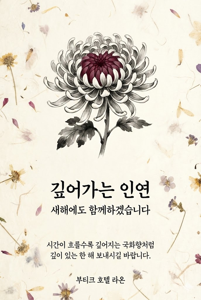 Design a premium and minimalist digital New Year greeting card for 2026 with a high-end brand aesthetic. The image must be a direct, flat view of the card design itself, with absolutely no surrounding background context or environment. Full-bleed edge-to-edge digital graphic card illustration. The overall mood is sophisticated, tranquil, and artistic, featuring a traditional Korean ink wash painting on a high-quality hanji paper surface. Layout Structure: The card follows a vertical hierarchy where a large-scale illustration is positioned at the top half, and all text elements are neatly arranged in the bottom half of the card surface. Visual Component (Top Section): The card surface itself is made of [creamy ivory hanji with pressed wildflower petals and visible fibers]. The soft diffusion texture should be visible on the flat card surface. In the top half of the card, a detailed traditional Korean ink wash painting is depicted. The illustration must appear to be directly painted onto the card surface, soaking into the paper fibers, and must not look like a separate layer pasted on top. The piece should be [a single, intricate chrysanthemum flower in full bloom with detailed petals]. The core focus of the illustration, [the center heart of the flower], must be rendered in a single vibrant and elegant color, [deep burgundy], while the rest of the painting remains in traditional black and gray ink gradation. This creates a striking selective color contrast on the hanji paper with visible brush strokes and soft diffusion. Keep the composition airy with wide negative space. Text Component (Bottom Section): All text is placed in the bottom half of the card, positioned below the illustration. All text must be rendered in an elegant and legible ink brush handwriting style Korean script with visible brush texture. Header: Below the illustration, place a clean title: ["깊어가는 인연"]. Immediately below it, add a small, sophisticated subtitle: ["새해에도 함께하겠습니다"]. Message Body: In the lower center, include a heartfelt 2-4 line message: ["시간이 흐를수록 깊어지는 국화향처럼\n깊이 있는 한 해 보내시길 바랍니다."]. Footer: At the very bottom, add the sender's name or brand name in a subtle signature style: ["부티크 호텔 라온"]. Style Notes: Flat lay design, isolated card view, vertical composition with image on top and text below, traditional Korean ink wash painting style, black and gray ink gradation with a single selective point color, visible brush strokes, wide negative space, minimalist, tranquil atmosphere. --ar 2:3