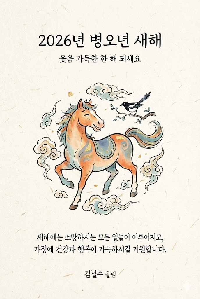| [새해 인사 카드] 2026년 새해 인사, 받는 이를 감동시킬 따뜻한 수채화 감성 카드 (0) | 2025.12.26 |