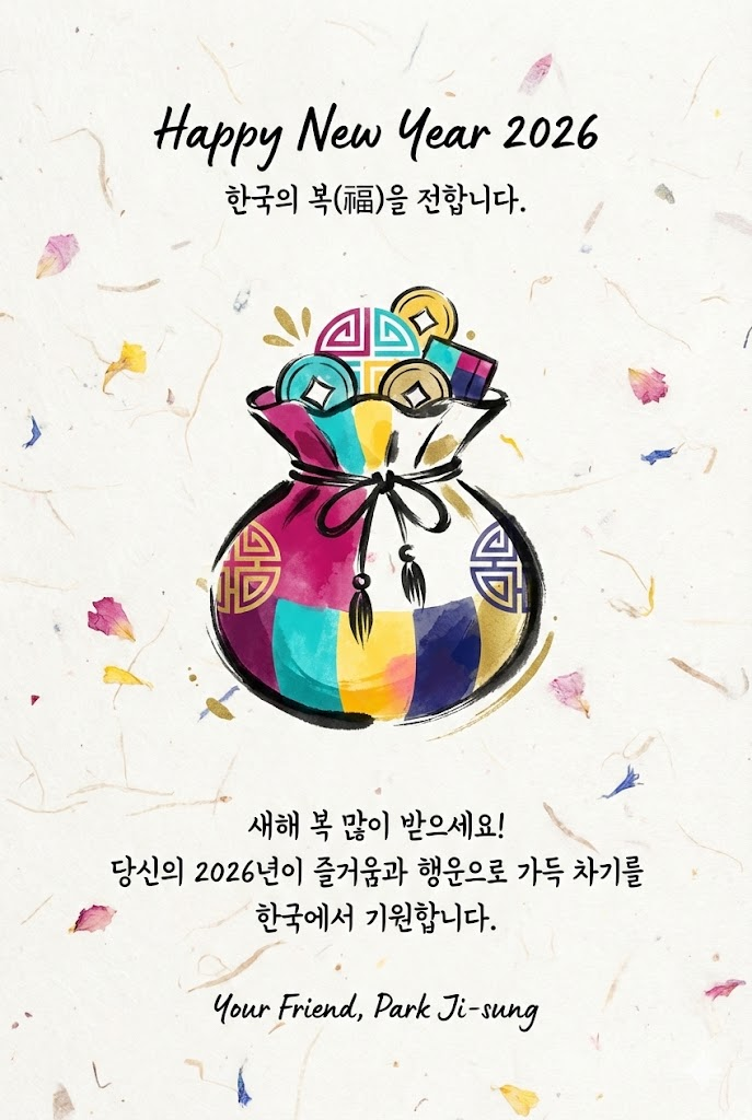 Message Body: In the lower center, include a heartfelt 2-4 line message: "새해 복 많이 받으세요! 당신의 2026년이 즐거움과 행운으로 가득 차기를 한국에서 기원합니다.".