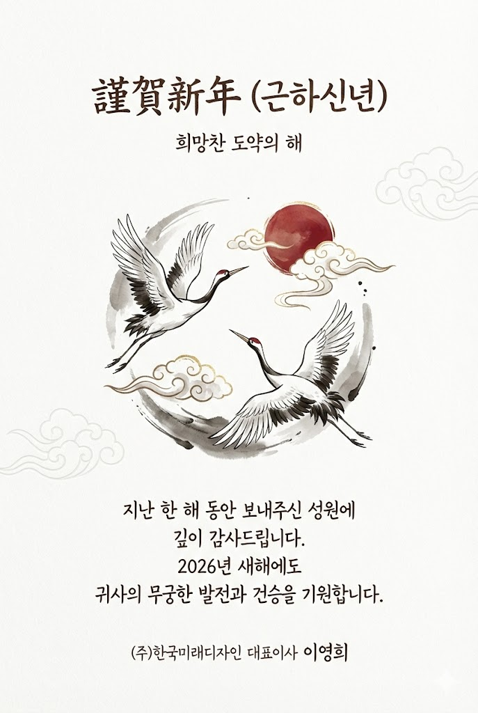 이 프롬프트는 단순히 한국적인 요소를 나열하는 것을 넘어, 현대적인 편집 디자인의 감각으로 재해석한 고품격 연하장을 만듭니다.