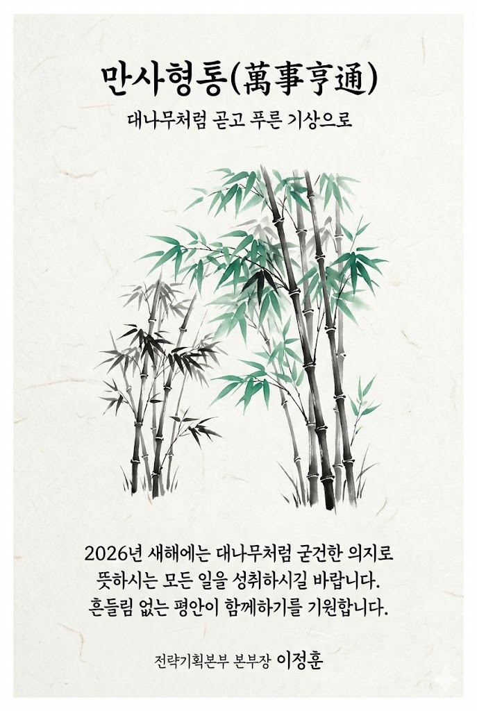 Message Body: In the lower center, include a heartfelt 2-4 line message: "2026년 새해에는 대나무처럼 굳건한 의지로 뜻하시는 모든 일을 성취하시길 바랍니다. 흔들림 없는 평안이 함께하기를 기원합니다.".
