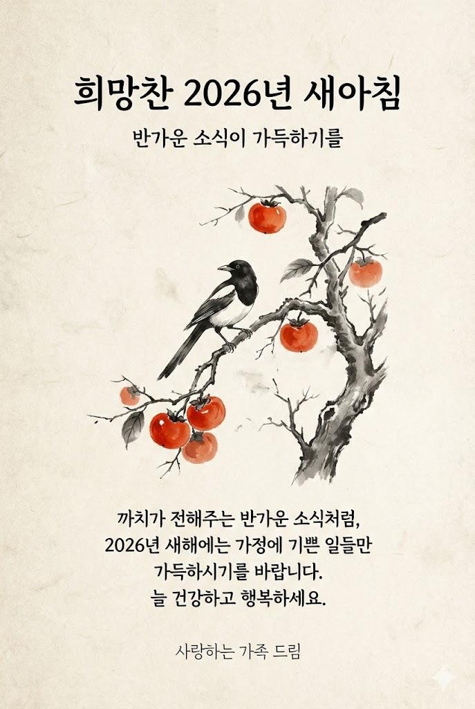 Message Body: In the lower center, include a heartfelt 2-4 line message: "까치가 전해주는 반가운 소식처럼, 2026년 새해에는 가정에 기쁜 일들만 가득하시기를 바랍니다. 늘 건강하고 행복하세요.".