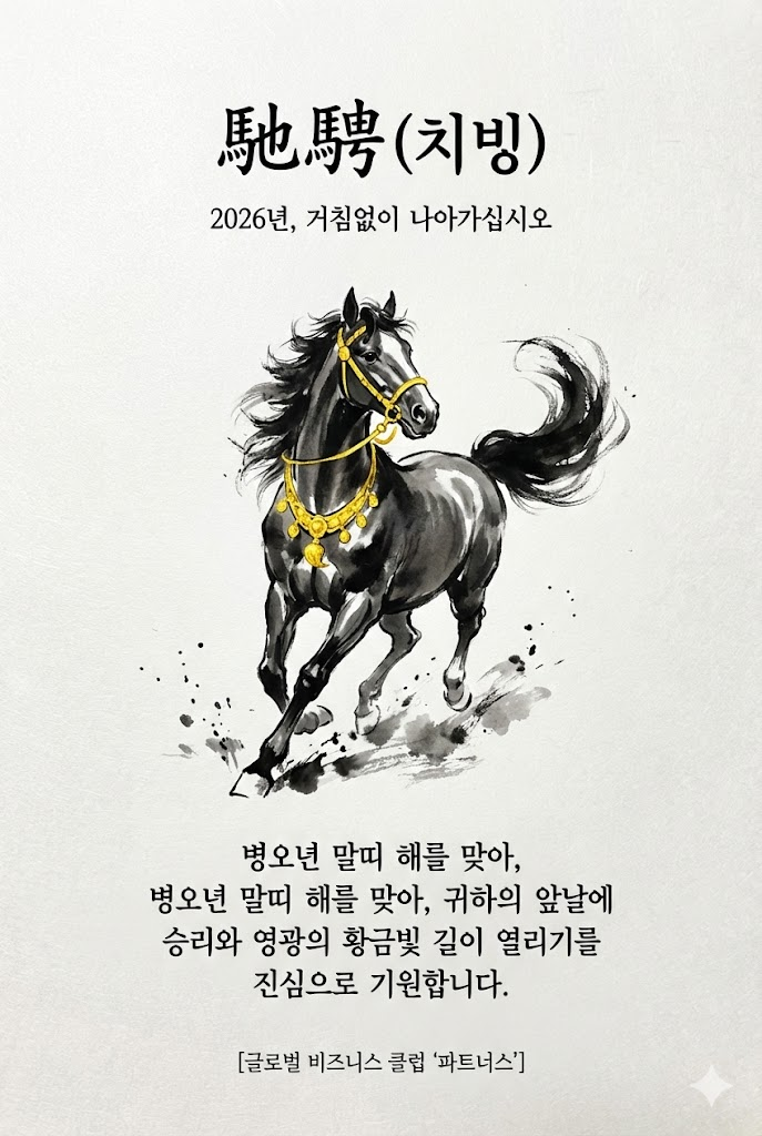 Header: At the top center, place a clean title written with an ink brush: [馳騁 (치빙)]. Below it, add a small, sophisticated subtitle: [2026년, 거침없이 나아가십시오].