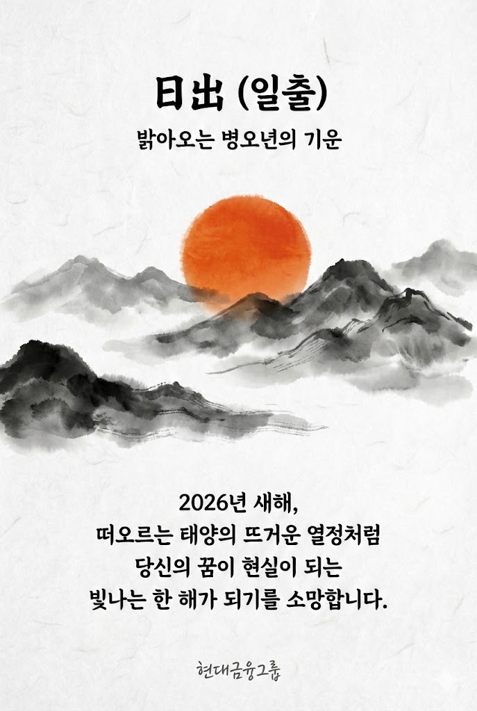 Message Body: In the lower center, include a heartfelt 2-4 line message: "[2026년 새해, 떠오르는 태양의 뜨거운 열정처럼 당신의 꿈이 현실이 되는 빛나는 한 해가 되기를 소망합니다.]".