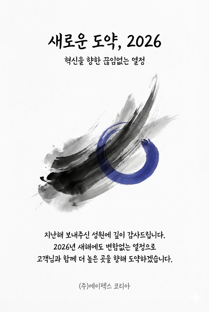 Message Body: In the lower center, include a heartfelt 2-4 line message: "지난해 보내주신 성원에 깊이 감사드립니다. 2026년 새해에도 변함없는 열정으로 고객님과 함께 더 높은 곳을 향해 도약하겠습니다.".