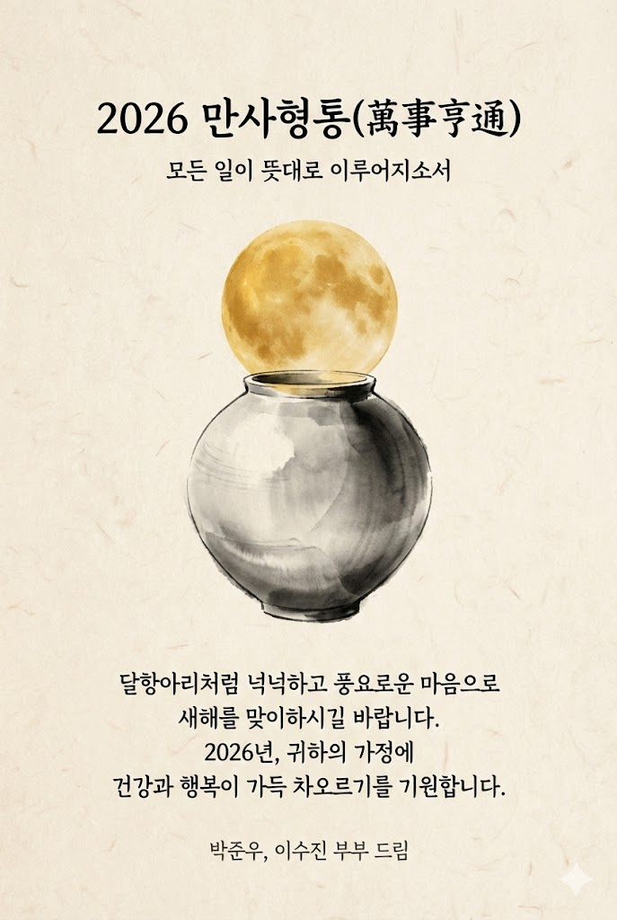 Message Body: In the lower center, include a heartfelt 2-4 line message: "달항아리처럼 넉넉하고 풍요로운 마음으로 새해를 맞이하시길 바랍니다. 2026년, 귀하의 가정에 건강과 행복이 가득 차오르기를 기원합니다.".
