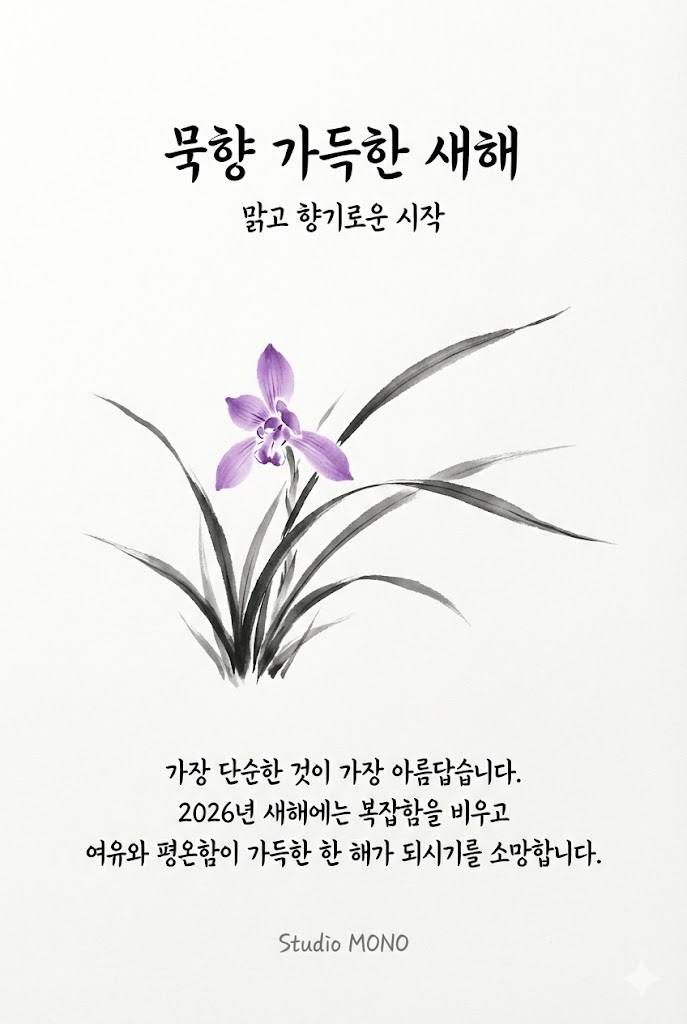 Header: At the top center, place a clean title written with an ink brush: 묵향 가득한 새해. Below it, add a small, sophisticated subtitle: 맑고 향기로운 시작.