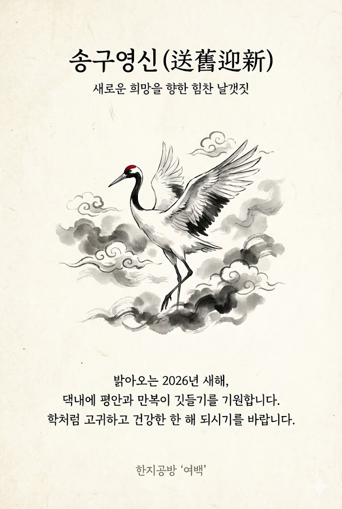 Header: At the top center, place a clean title written with an ink brush: 송구영신 (送舊迎新). Below it, add a small, sophisticated subtitle: 새로운 희망을 향한 힘찬 날갯짓.
