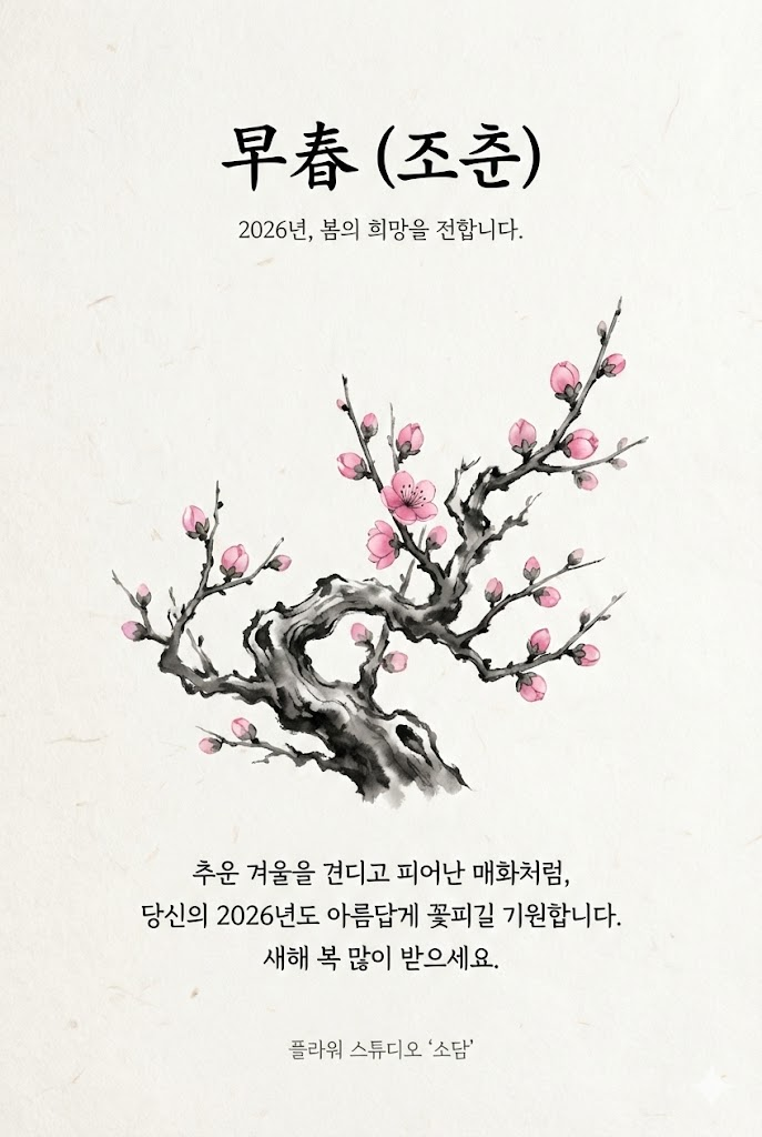 Card Surface: The card itself is made of [결이 고운 미색의 수제 순지]. The soft diffusion texture should be visible on the flat card surface. Header: At the top center, place a clean title written with an ink brush: 早春 (조춘). Below it, add a small, sophisticated subtitle: 2026년, 봄의 희망을 전합니다.