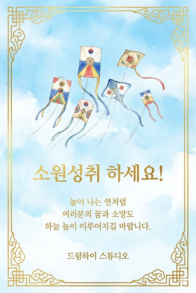 Modern oriental watercolor illustration style, sophisticated and calm atmosphere. Full-bleed edge-to-edge digital graphic card illustration. Background color is a soft wash of [clear light blue and breezy white]. The entire composition is framed by an elegant traditional Korean gold border placed at the outermost edges. The central illustration features [several traditional Korean kites tied with ribbons flying high in a clear winter sky]. The layout includes centered text rendered in distinct shining gold color: a large title text reading "소원성취 하세요!", followed by a smaller body text reading "높이 나는 연처럼 여러분의 꿈과 소망도 하늘 높이 이루어지길 바랍니다.", and a sender name "드림하이 스튜디오" at the bottom center. High resolution. --ar 2:3