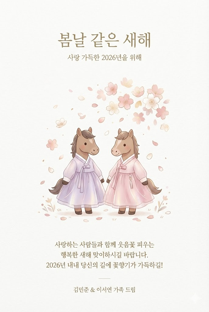 Header: At the top center, place a clean title: 봄날 같은 새해. Below it, add a small, sophisticated subtitle: 사랑 가득한 2026년을 위해.