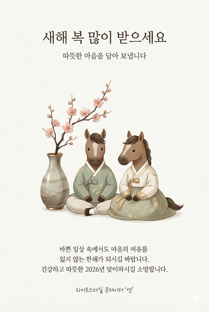 Message Body: In the lower center, include a heartfelt message: "바쁜 일상 속에서도 마음의 여유를 잃지 않는 한 해가 되시길 바랍니다. 건강하고 따뜻한 2026년 맞이하시길 소망합니다.".