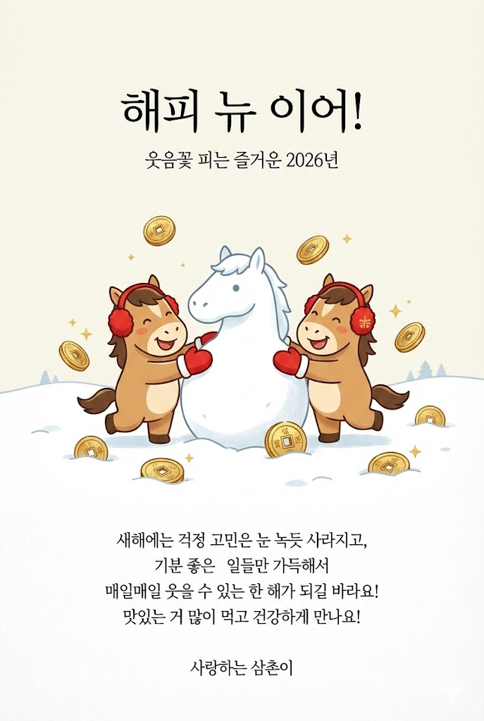 | [새해 인사 카드] 2026년 병오년(말띠 해) 일러스트 연하장 V2 (0) | 2025.12.26 |