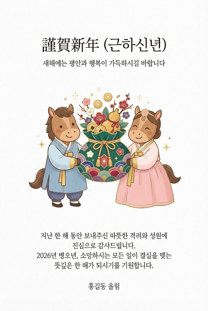 Header: At the top center, place a clean title: [謹賀新年 (근하신년)]. Below it, add a small, sophisticated subtitle: [새해에는 평안과 행복이 가득하시길 바랍니다].
