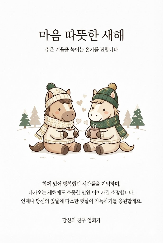 Header: At the top center, place a clean title: [마음 따뜻한 새해]. Below it, add a small, sophisticated subtitle: [추운 겨울을 녹이는 온기를 전합니다].