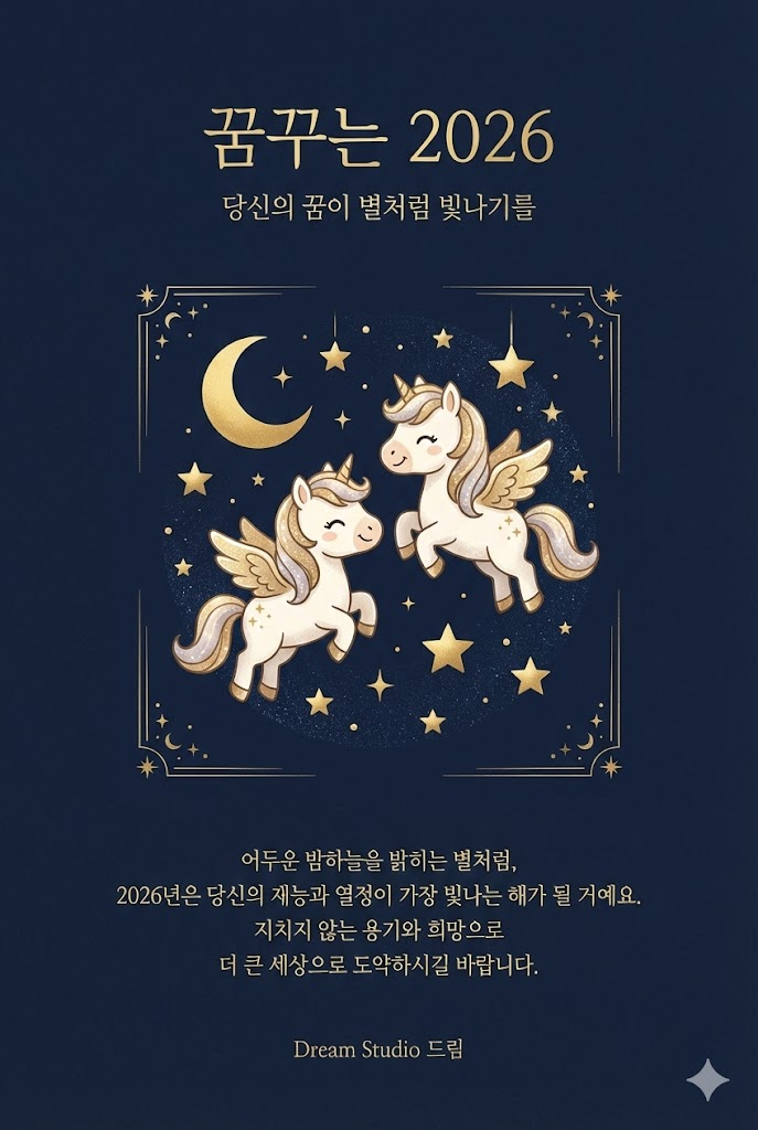 Message Body: In the lower center, include a heartfelt message: "어두운 밤하늘을 밝히는 별처럼, 2026년은 당신의 재능과 열정이 가장 빛나는 해가 될 거예요. 지치지 않는 용기와 희망으로 더 큰 세상으로 도약하시길 바랍니다."