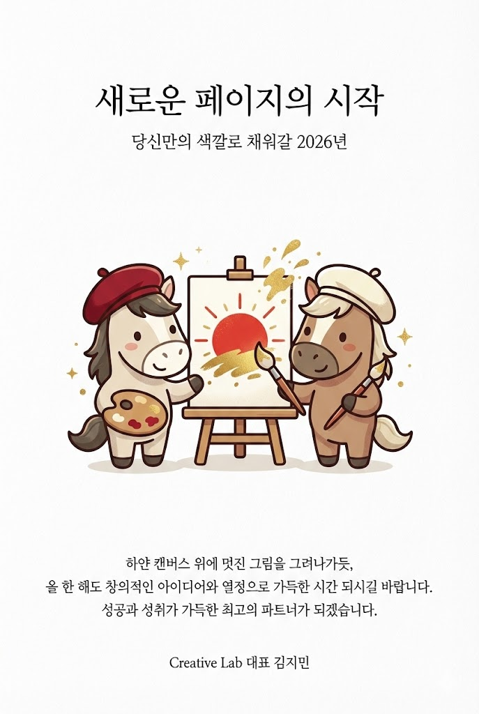 Message Body: In the lower center, include a heartfelt message: "하얀 캔버스 위에 멋진 그림을 그려나가듯, 올 한 해도 창의적인 아이디어와 열정으로 가득한 시간 되시길 바랍니다. 성공과 성취가 가득한 최고의 파트너가 되겠습니다."