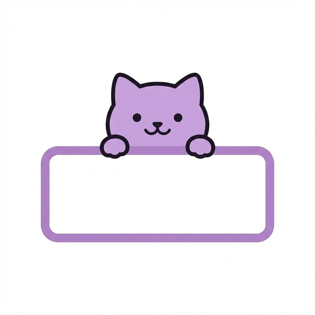 A cute, minimalist flat vector illustration of a soft purple cat peeking over the top edge of a blank rectangular name board. Only the head and two small paws are visible above the board. The soft purple cat is colored in soft purple, and the thick, rounded border of the white sign board is the exact same soft purple. The design features simple facial features with small black eyes and a sweet expression. Thick dark outlines, flat color palette, no shadows or gradients, clean and simple aesthetic. Isolated on a solid white background. --ar 1:1