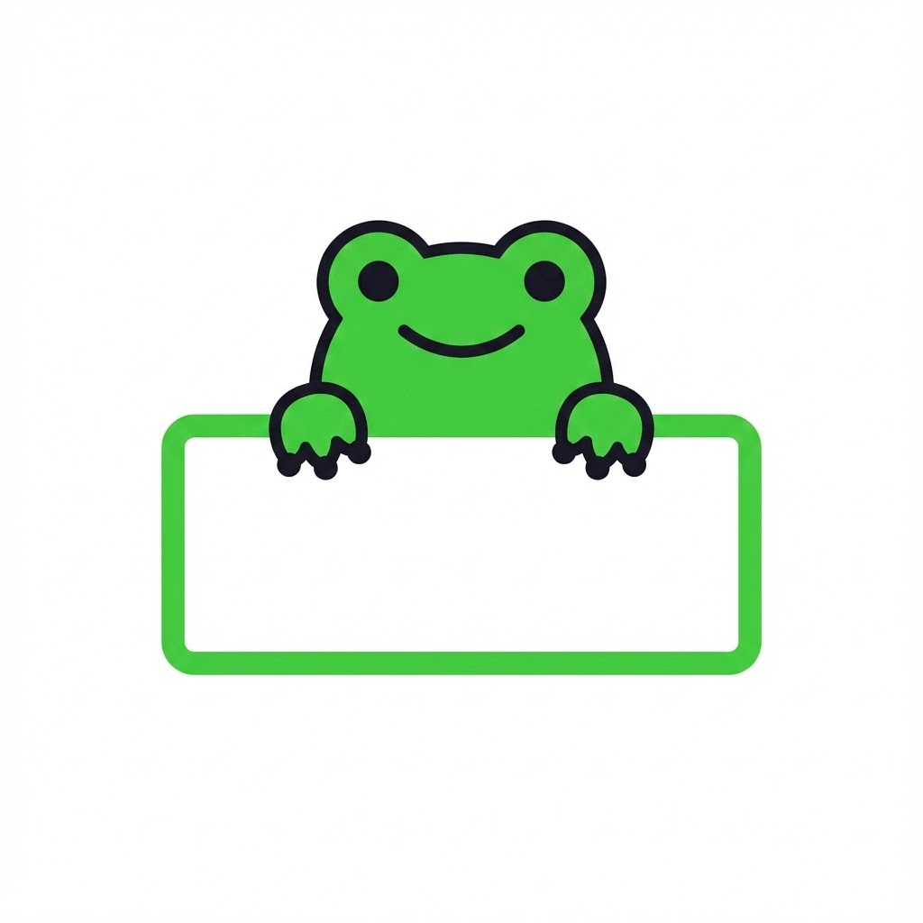 A cute, minimalist flat vector illustration of a green baby frog peeking over the top edge of a blank rectangular name board. Only the head and two small paws are visible above the board. The green baby frog is colored in vibrant green, and the thick, rounded border of the white sign board is the exact same vibrant green. The design features simple facial features with small black eyes and a sweet expression. Thick dark outlines, flat color palette, no shadows or gradients, clean and simple aesthetic. Isolated on a solid white background. --ar 1:1