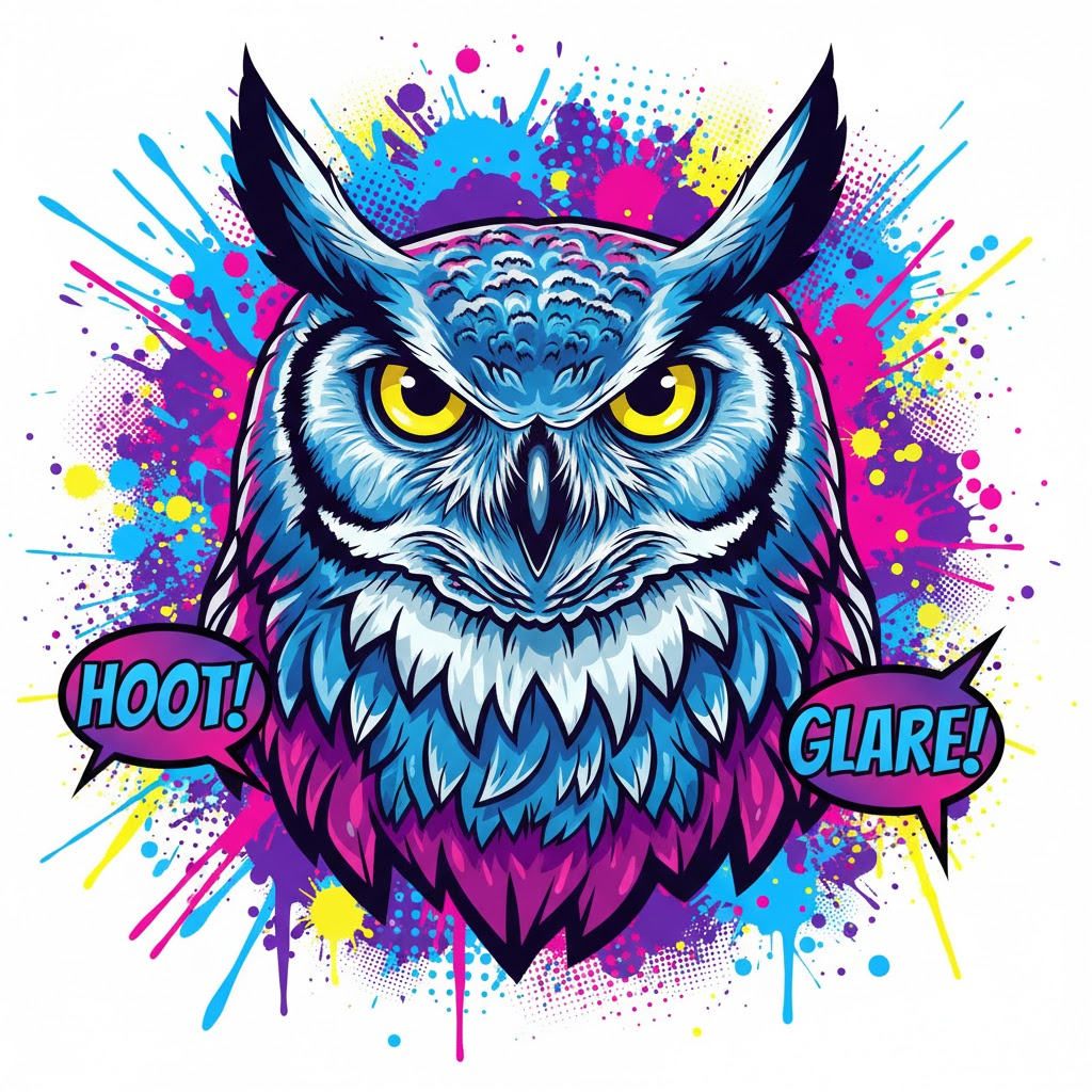 A high-quality vector art portrait of a [Great Horned Owl], facing forward with an expressive and intense gaze. The artistic style blends modern pop art with clean sticker illustration aesthetics. Use a vibrant and high-contrast color palette focusing on [Neon Blue, Silver, and Magenta]. The background features dynamic paint splashes, halftone dots, and abstract splatter effects in contrasting hues to add energy. Bold black outlines, smooth shading, and detailed texture rendering. 8k resolution, digital illustration, vector style, trending on Behance.