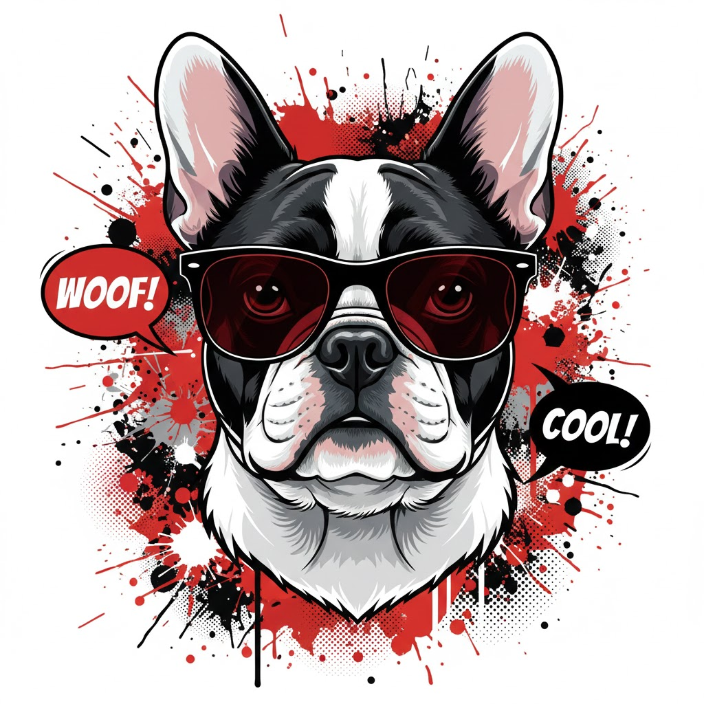 A high-quality vector art portrait of a [French Bulldog wearing sunglasses], facing forward with an expressive and intense gaze. The artistic style blends modern pop art with clean sticker illustration aesthetics. Use a vibrant and high-contrast color palette focusing on [Vivid Red, Black, and White]. The background features dynamic paint splashes, halftone dots, and abstract splatter effects in contrasting hues to add energy. Bold black outlines, smooth shading, and detailed texture rendering. 8k resolution, digital illustration, vector style, trending on Behance